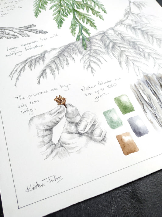 Western Redcedar Tree Study- an original botanical painting, by Kristen Johns, 11x14inches