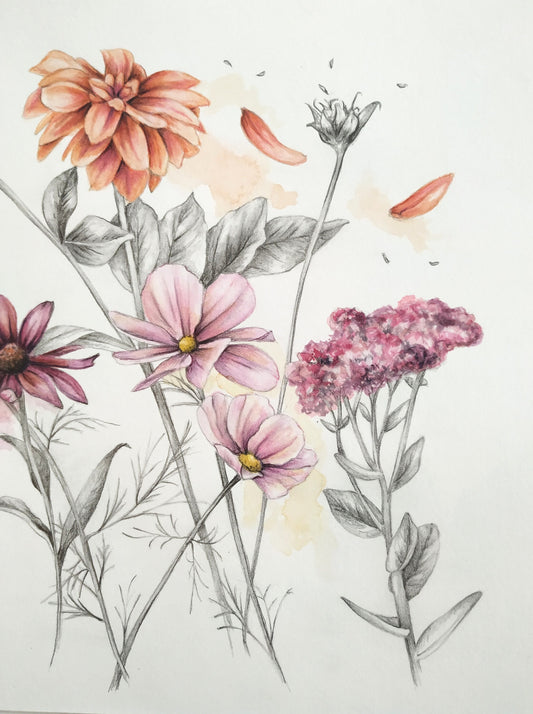 Garden Party with cosmos & dahlia - original painting, 8.5x11 inches