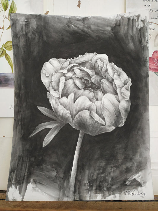 Peony, an original drawing by artist Kristen Johns, 9x12 inch, graphite on paper