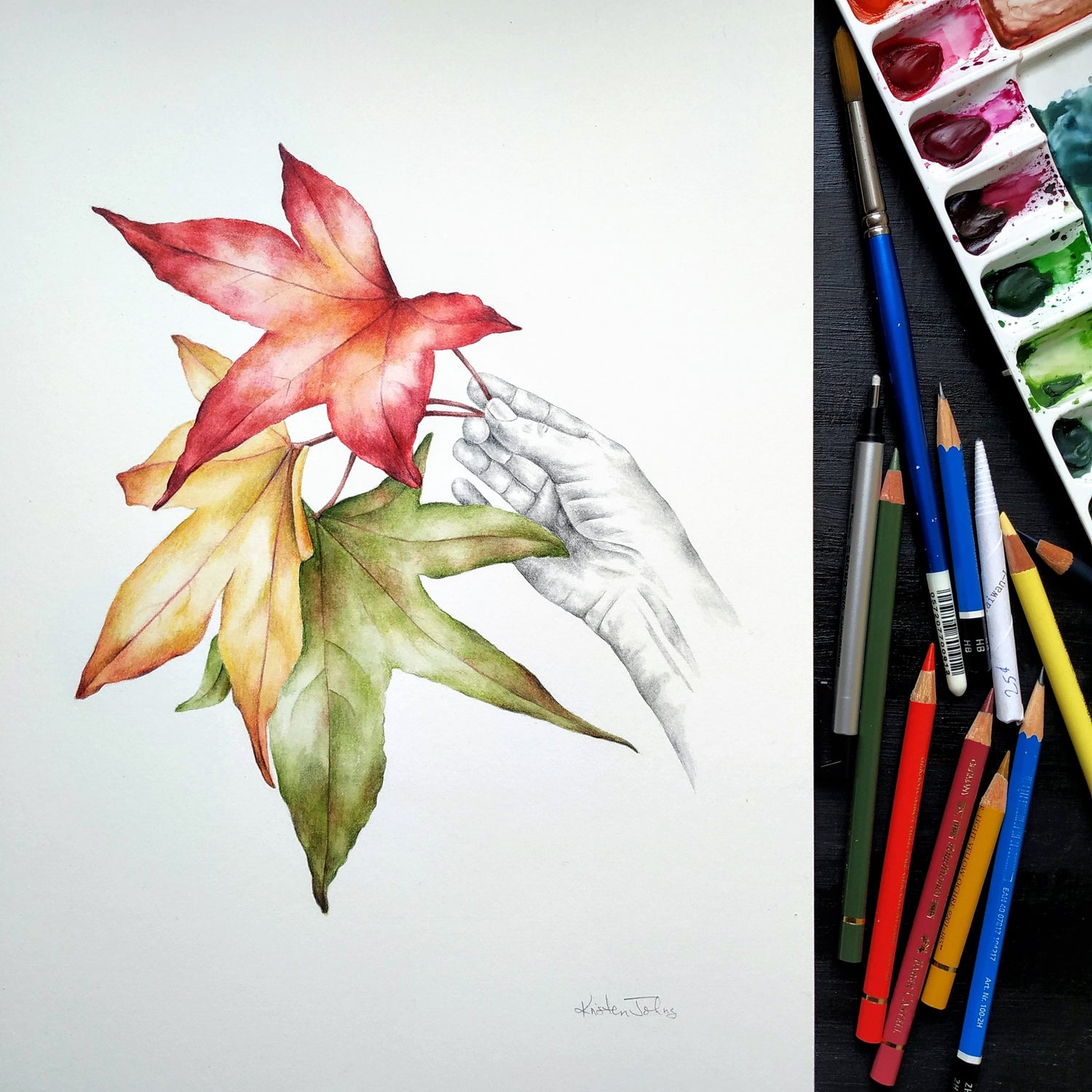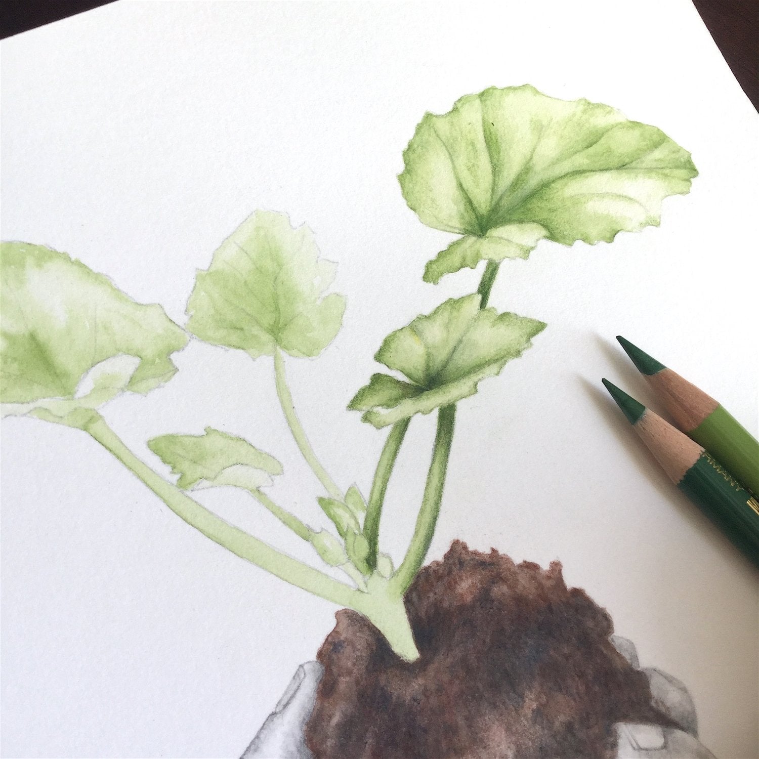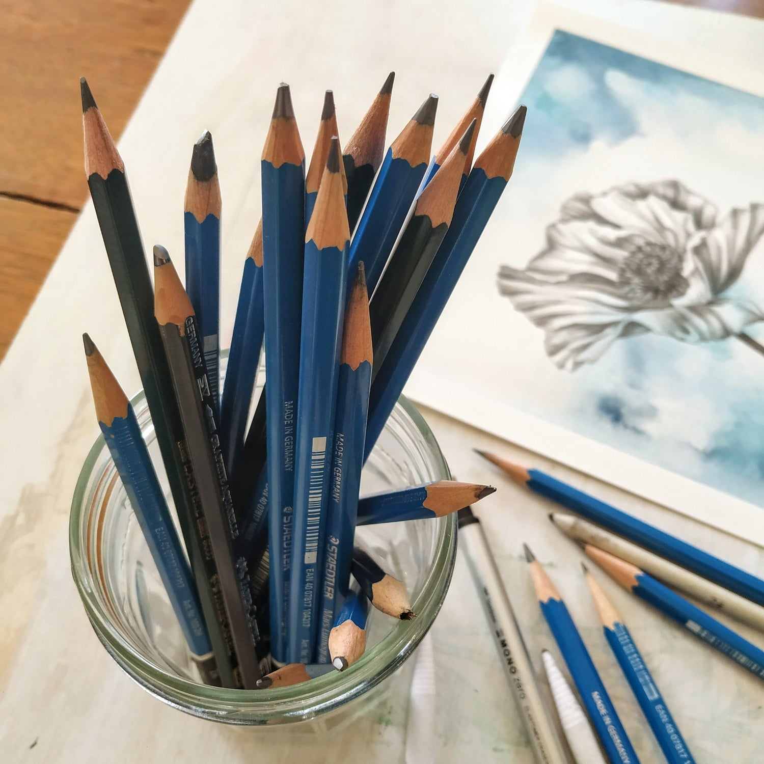 I use watercolours, graphite, and coloured pencil on paper to create my work - sometimes one or two of these, and sometimes all three in one piece. Washes of colour, refined details and smudges of graphite all play a part in my creative process. I love to capture the mood of the plants with light washes of colour as well as bring out the incredible details of the subject’s lines, textures and folds with the coloured pencils. I use oil based coloured pencils by Faber-Castell (Polychromos) which blend together very well and offer punchy colour to the piece. Drawing my hand is a real joy as well which I often capture in graphite in order to bring light and importance to the plants that I paint in colour.