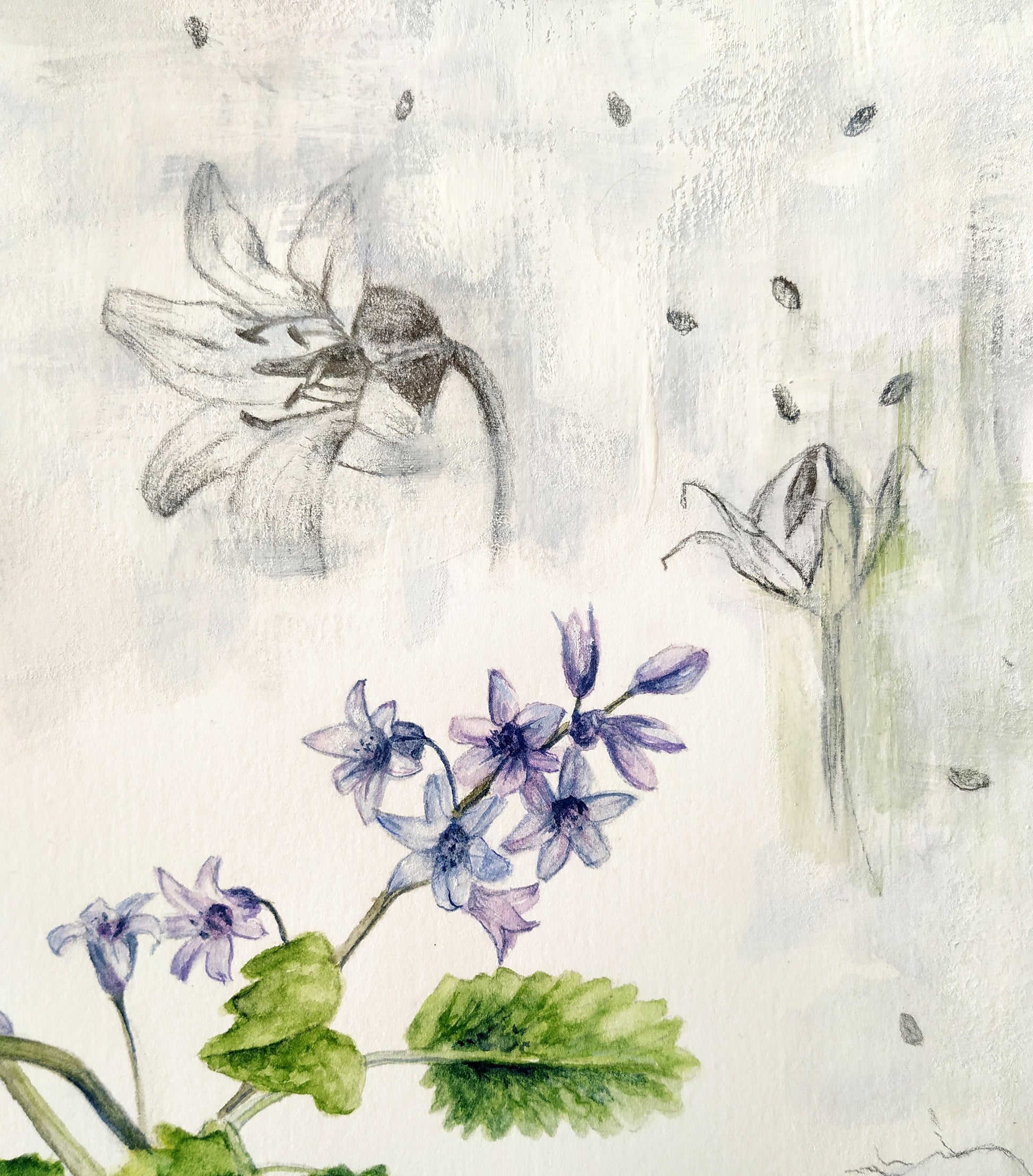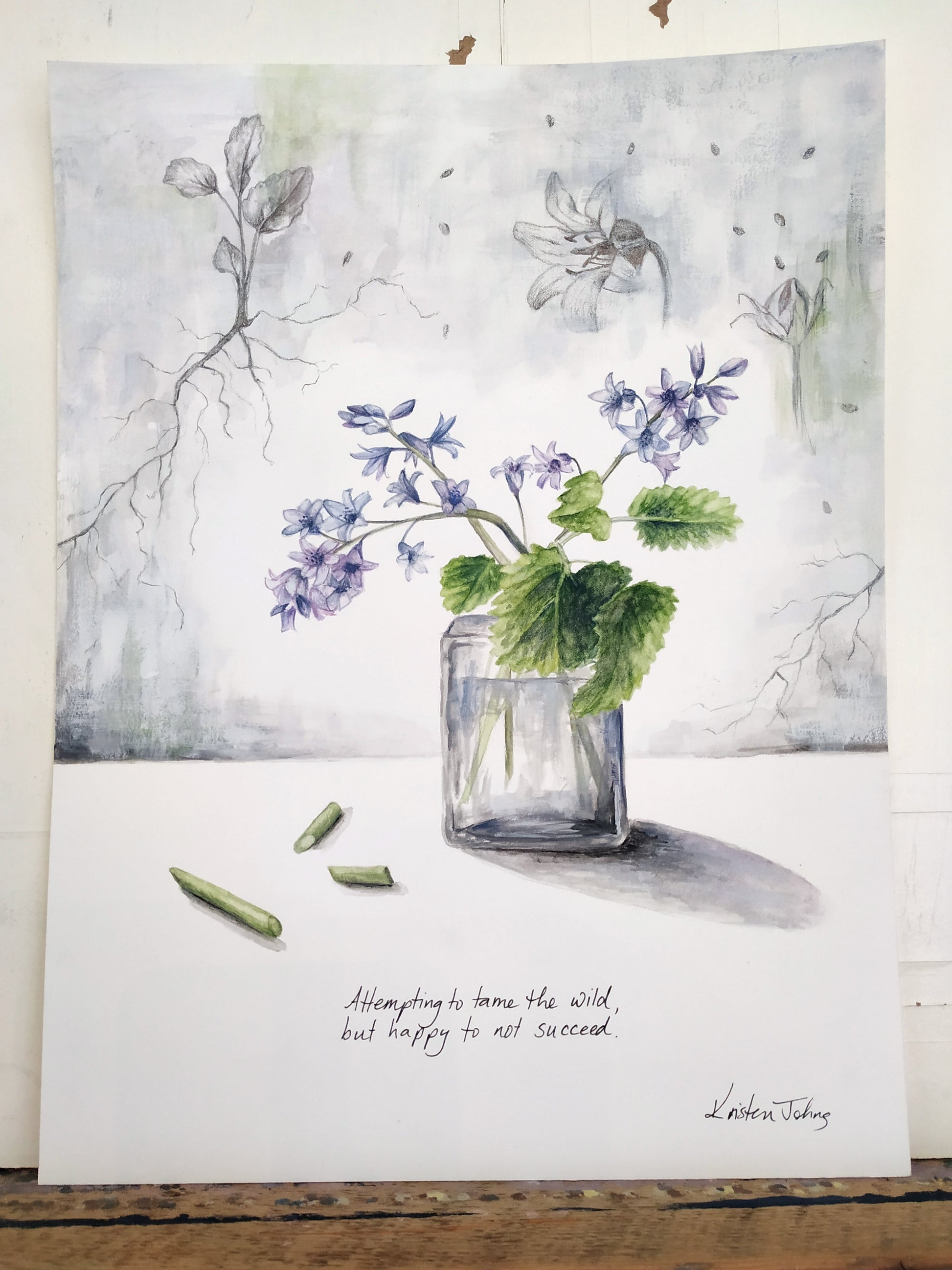 This is a painting of bluebells and mint, both of which are "wild" or "invasive" in my garden, depending on how you look at it. I love painting these quiet, modest bouquets that have a larger story to tell if you know the plants or have a garden of your own. Every year when the bluebells and mint start popping up, I admire their resilience and love them...until I don't.
