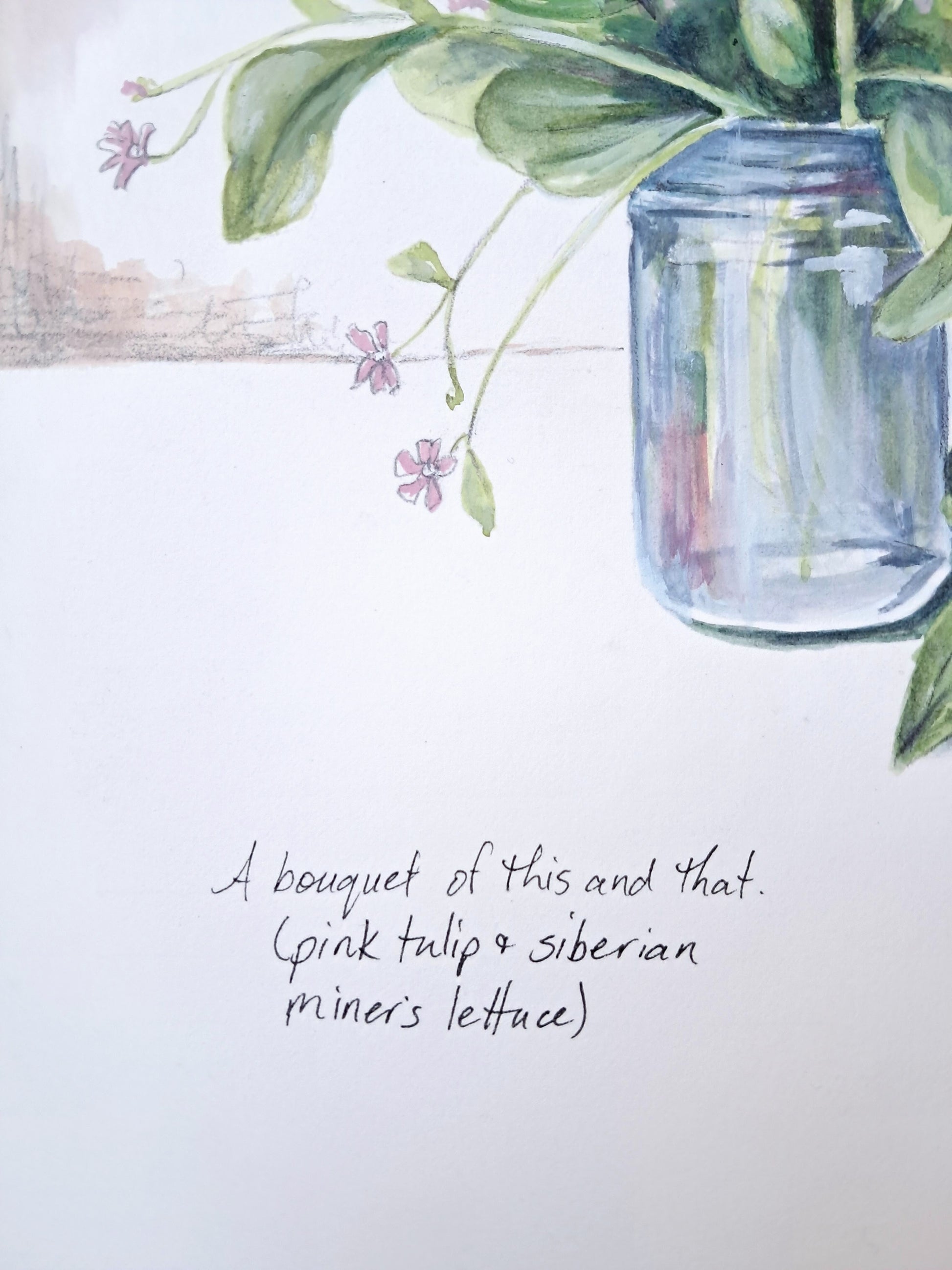 "A bouquet of this and that. (pink tulip and siberian miner's lettuce)"